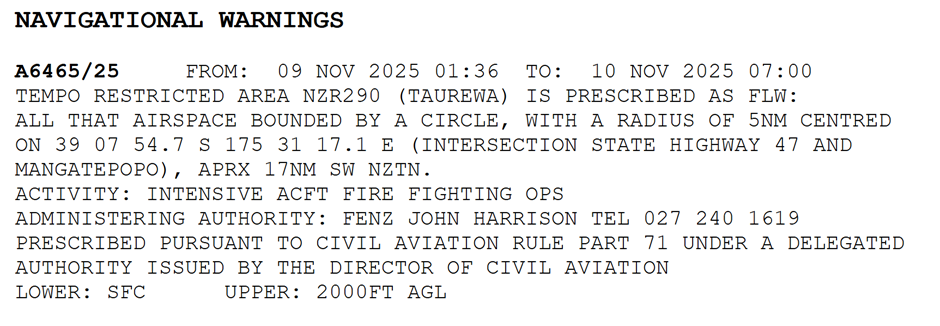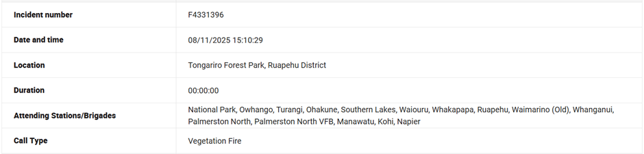 On Saturday 08 November 2025 a large vegetation fire started in Tongariro National Park. By 10pm that night approximately 400ha was thought to be on fire, and by the following evening the fire had spread to 1,000ha. Throughout the day there had been 13 helicopters and 3 fixed wing aircraft fighting the fire.[1]